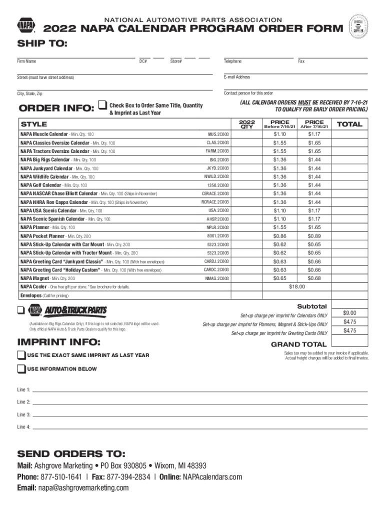 N AT I O N A L A U T O M O T I V E PA R T S A S S O C I AT I O N2022 NAPA CALENDAR PROGRAM ORDER FORM SHIP TO: Firm Named×Store×TelephoneFaxStreet (must have street address×Email Addressing, State,