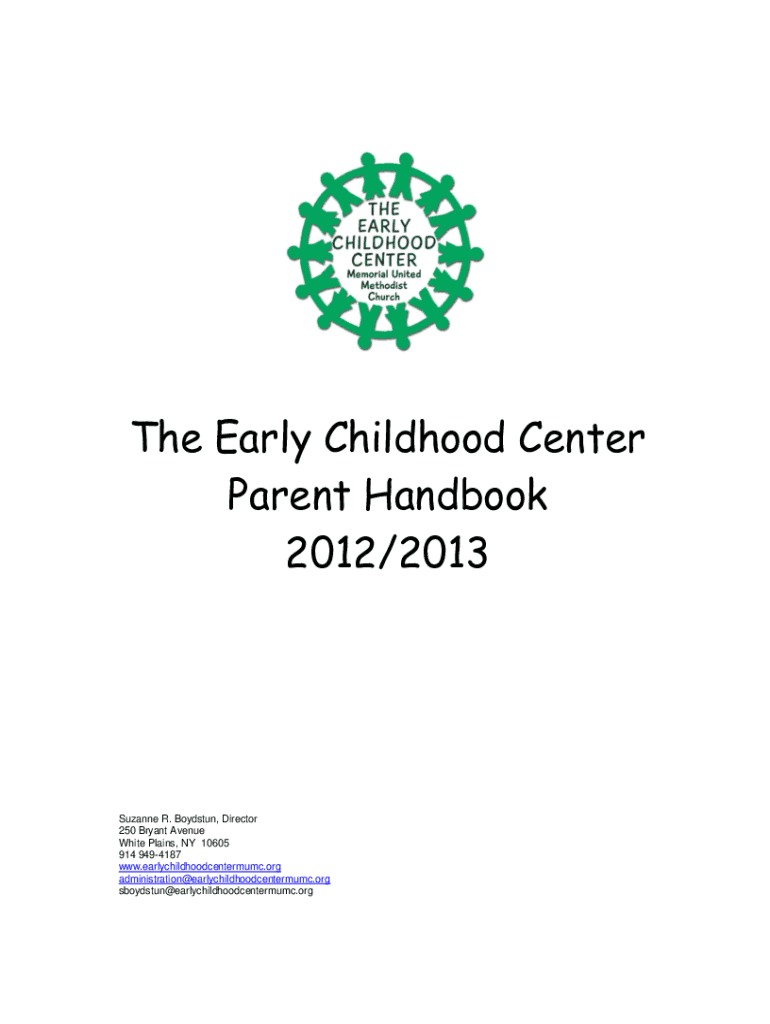 The Early Childhood Center Parent Handbook 2012×2013Suzanne R. Boyd stun, Director 250 Bryant Avenue White Plains, NY 10605 914 9494187 www.earlychildhoodcentermumc.org administration×earlychildhoodcentermumc.org