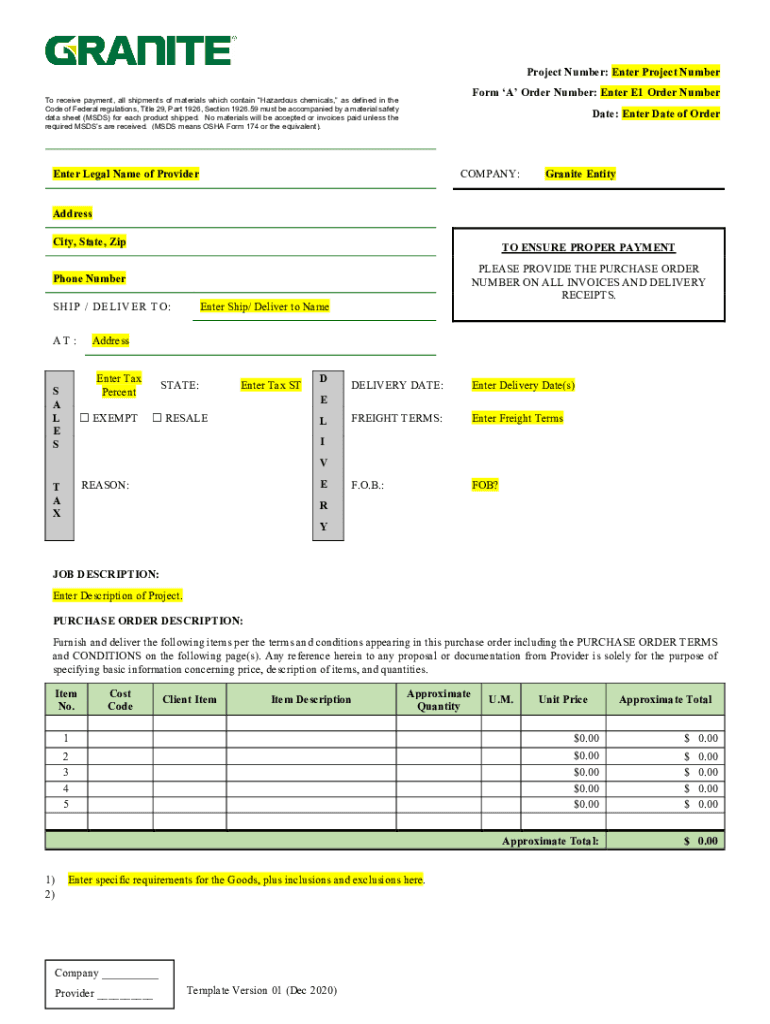 Project Number: Enter Project Number Form A Order Number: Enter E1 Order Humberto receive payment, all shipments of materials which contain Hazardous chemicals, as defined in the Code of Federal regulations,