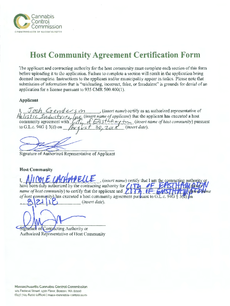 CCannabisControl CommissionCOMMON W l!ALTO OF M ASSACHUSETTSHost Community Agreement Certification Form The applicant and contracting authority for the host community must complete each section of