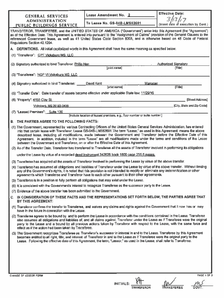 Lease Amendment No. GENERAL SERVICES ADMINISTRATION PUBLIC BUILDINGS SERVICE211 To Lease No. GS04 ALMS 62601\'3i ×0a 7Effective Date: (Insert ate execution by Govt.×TRANSFEROR, TRANSFEREE, and the