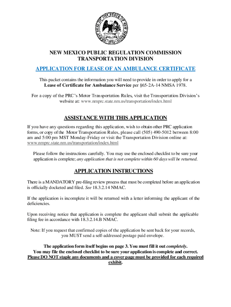 NEW MEXICO PUBLIC REGULATION COMMISSION TRANSPORTATION DIVISION APPLICATION FOR LEASE OF AN AMBULANCE CERTIFICATE This packet contains the information you will need to provide in order to apply for