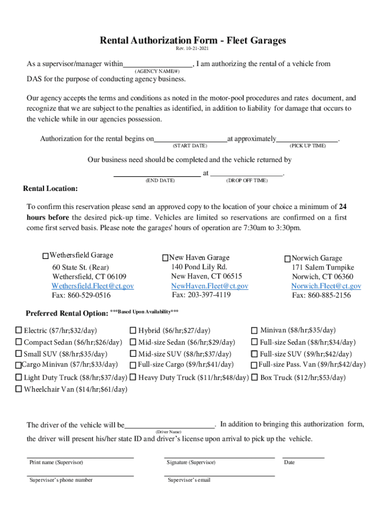 Rental Authorization Form Fleet Garages Rev. 10212021As a supervisor×manager within, I am authorizing the rental of a vehicle from (AGENCY NAME/#)WAS for the purpose of conducting agency business.