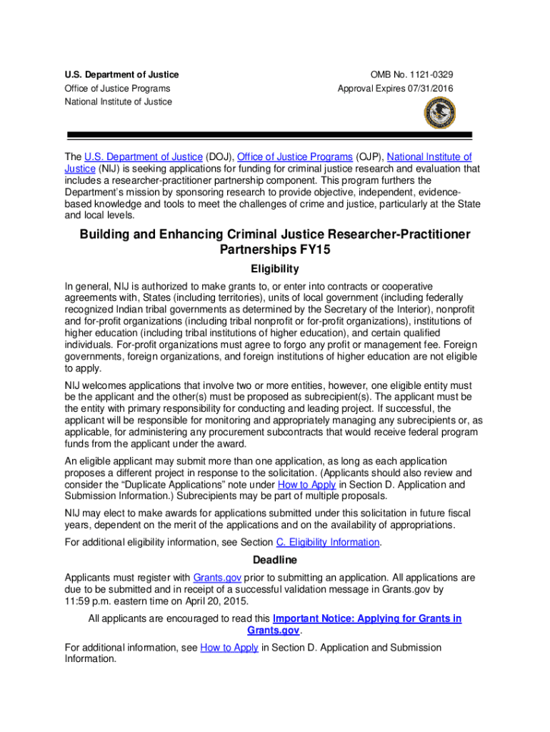 U.S. Department of Justice Office of Justice Programs National Institute of Justice OMB No. 11210329 Approval Expires 07×31/2016The U.S. Department of Justice (DOJ×, Office of Justice Programs (JP×,