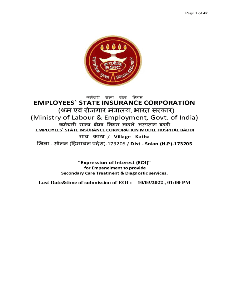Page 1 of 47EMPLOYEES` STATE INSURANCE CORPORATION (, ) (Ministry of Labor & Employment, Govt. of India) EMPLOYEES` STATE INSURANCE CORPORATION MODEL HOSPITAL BADDIE
