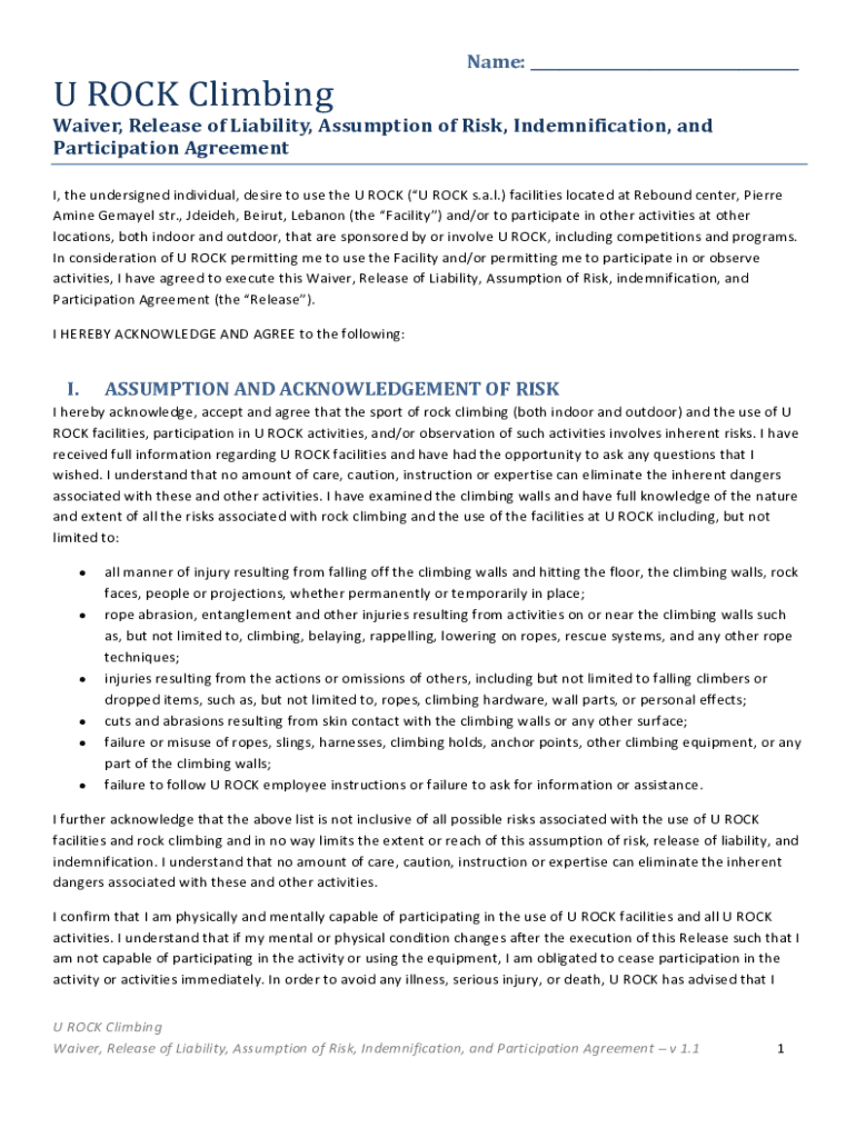 U ROCK ClimbingName: ___Waiver, Release of Liability, Assumption of Risk, Indemnification, participation Agreement, the undersigned individual, desire to use the U ROCK (U ROCK s.a.l.) facilities