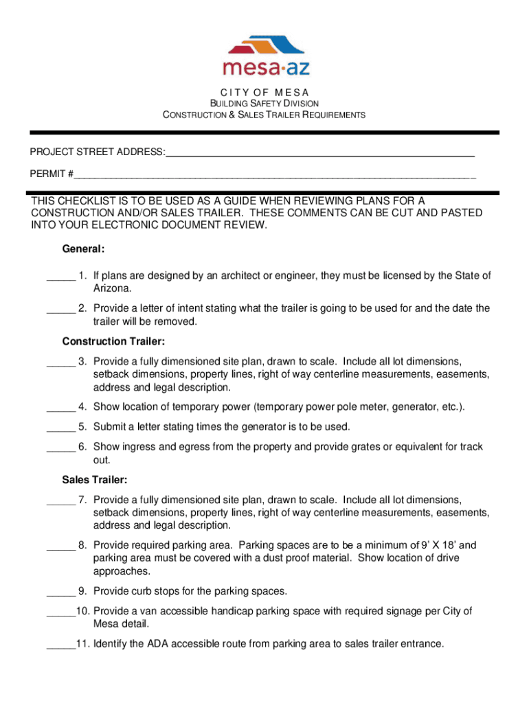 CITY OF MESA BUILDING SAFETY DIVISION CONSTRUCTION & SALES TRAILER REQUIREMENTSPROJECT STREET ADDRESS: PERMIT #___THIS CHECKLIST IS TO BE USED AS A GUIDE WHEN REVIEWING PLANS FOR A CONSTRUCTION AND×OR