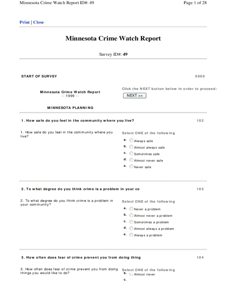 Minnesota Crime Watch Report ID#: 49Page 1 of 28Print | Close Minnesota Crime Watch Report Survey ID#: 49START OF SURVEY Minnesota Crime Watch Report 1999 0000Click the NEXT button below in order