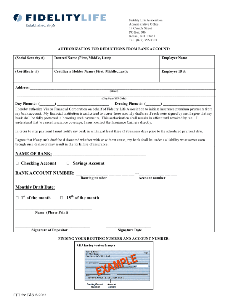 Fidelity Life Association Administrative Office: 17 Church Street PO Box 506 Keen, NH 03431 Tel: (877) 3523303AUTHORIZATION FOR DEDUCTIONS FROM BANK ACCOUNT: (Social Security #)Insured Name (First,