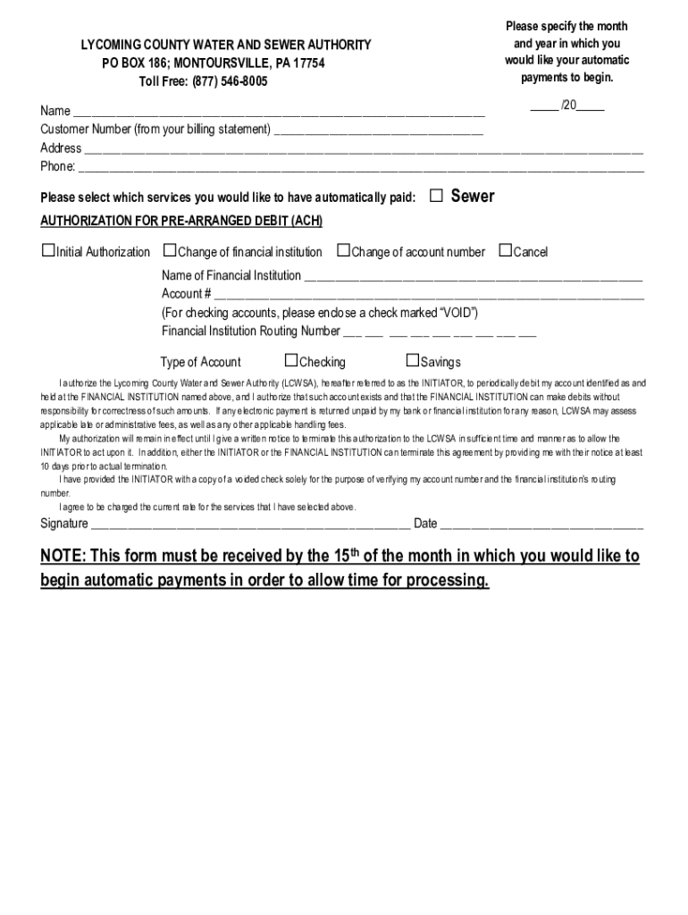 Please specify the month and year in which you would like your automatic payments to begin.LYCOMING COUNTY WATER AND SEWER AUTHORITY PO BOX 186; MONTOURSVILLE, PA 17754 Toll Free: (877× 5468005___