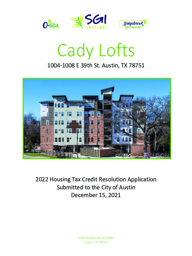 Cady Lofts10041008 E 39th St. Austin, TX 787512022 Housing Tax Credit Resolution Application Submitted to the City of Austin December 15, 20215501A Balconies Dr. ×302 Austin, TX 78731December 15,