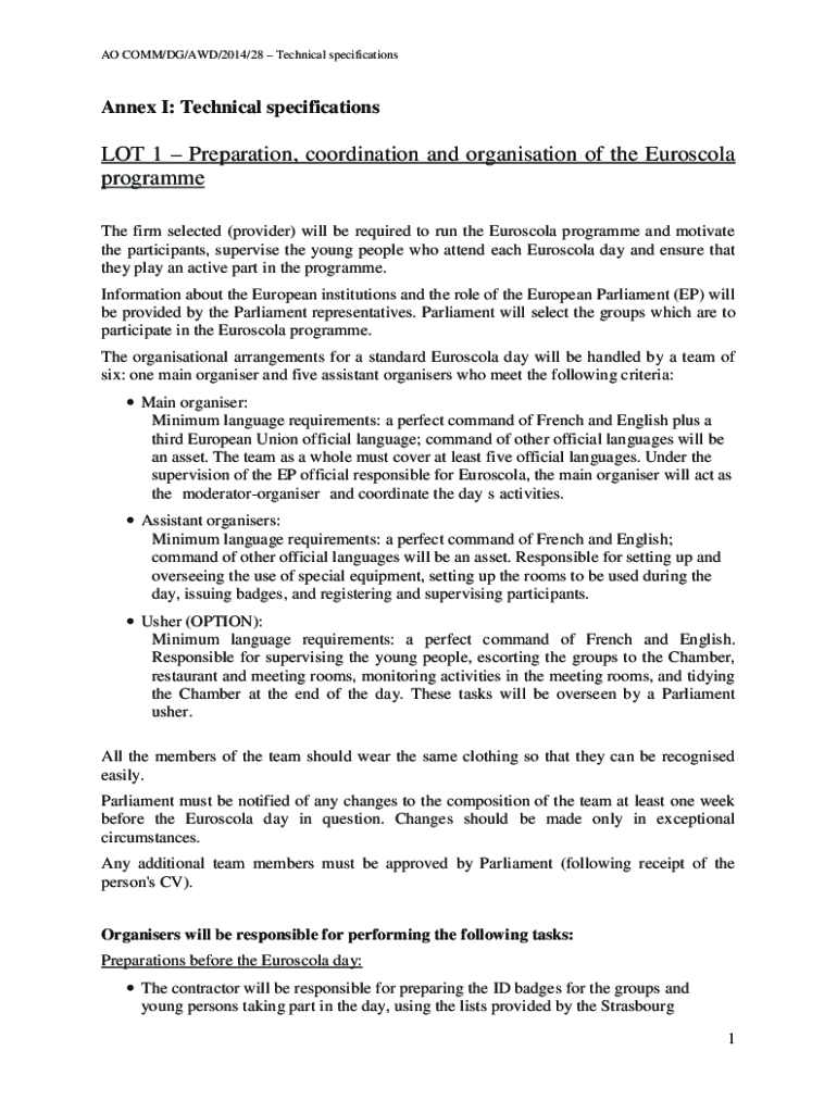 AO COMM×DG/AWD×2014×28 Technical specificationsAnnex I: Technical specifications 1 Preparation, coordination and organization of the Euros' cola program The firm selected (provider) will be required