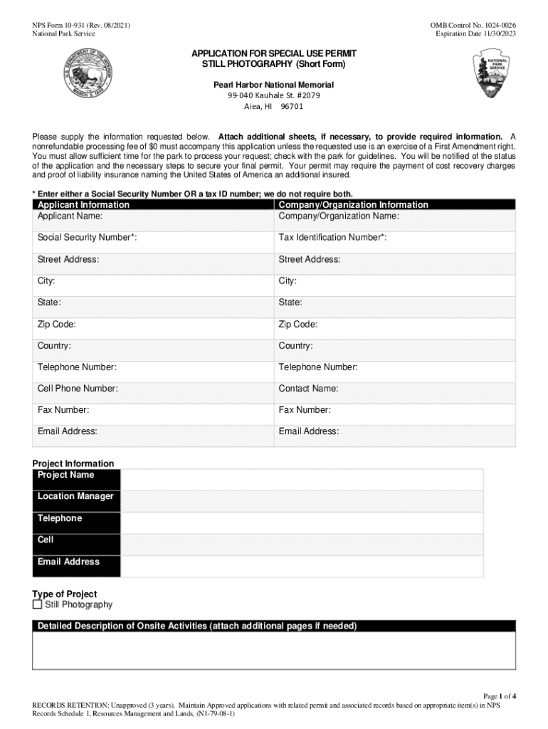 NPS Form 10931 (Rev. 08×2021) National Park Service OMB Control No. 10240026 Expiration Date 11×30/2023APPLICATION FOR SPECIAL USE PERMIT STILL PHOTOGRAPHY (Short Form) Pearl Harbor National Memorial99040