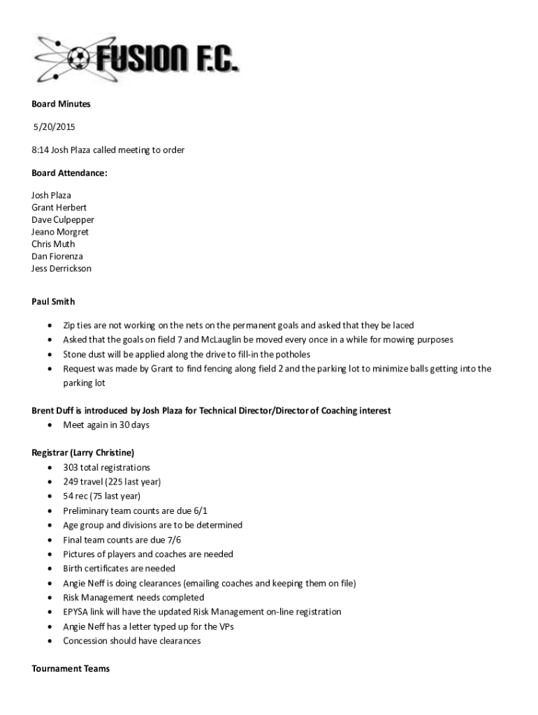 Board Minutes 5×20/2015 8:14 Josh Plaza called meeting to order Board Attendance: Josh Plaza Grant Herbert Dave Pepper Jean Margret Chris Much Dan Fiorella Jess Derrick son Paul Smith Zip ties are