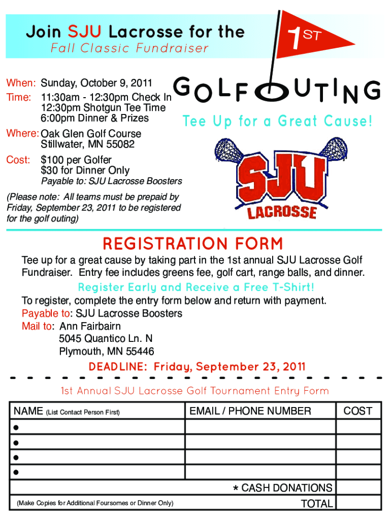 Join SFU Lacrosse for the Fall Classic Fundraiser1STGO L F OUT I NG When: Sunday, October 9, 2011, Time: 11:30am 12:30pm Check In 12:30pm Shotgun Tee Time 6:00pm Dinner & Prizes Where: Oak Glen Golf