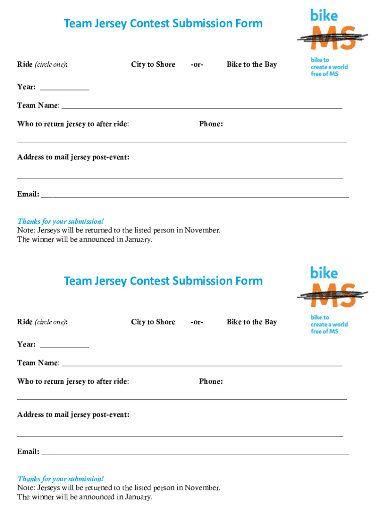 Team Jersey Contest Submission Form Ride (circle one):City to ShoreorBike to the Barrier: ___ Team Name: ___ Who to return jersey to after ride:Phone:___ Address to mail jersey postevent: ___ Email: