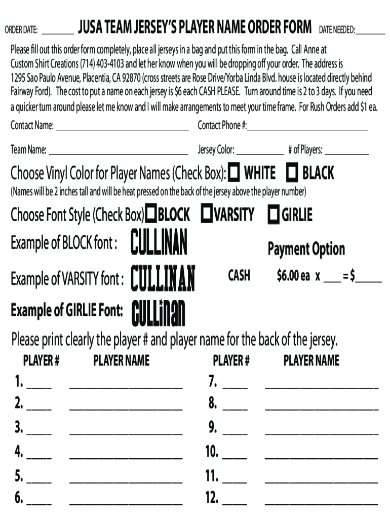 ORDER DATE: ___JUST TEAM JERSEYS PLAYER NAME ORDER FORMAT NEEDED: ___Please fill out this order form completely, place all jerseys in a bag and put this form in the bag. Call Anne at Custom Shirt
