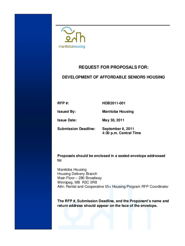 REQUEST FOR PROPOSALS FOR: DEVELOPMENT OF AFFORDABLE SENIORS HOUSING RFP #:HDB2011001Issued By:Manitoba HousingIssue Date:May 30, 2011Submission Deadline:September 6, 2011 4:30 p.m. Central TimeProposals