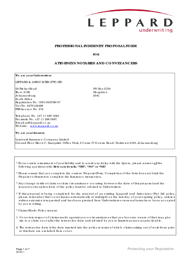 PROFESSIONAL INDEMNITY PROPOSAL FORM ATTORNEYS NOTARIES AND CONVEYANCES We are your Underwriters: LEOPARD & ASSOCIATES (PTY) LTD 28 Flicker Road Igloo 2196 Johannesburg South Africa Registration No.