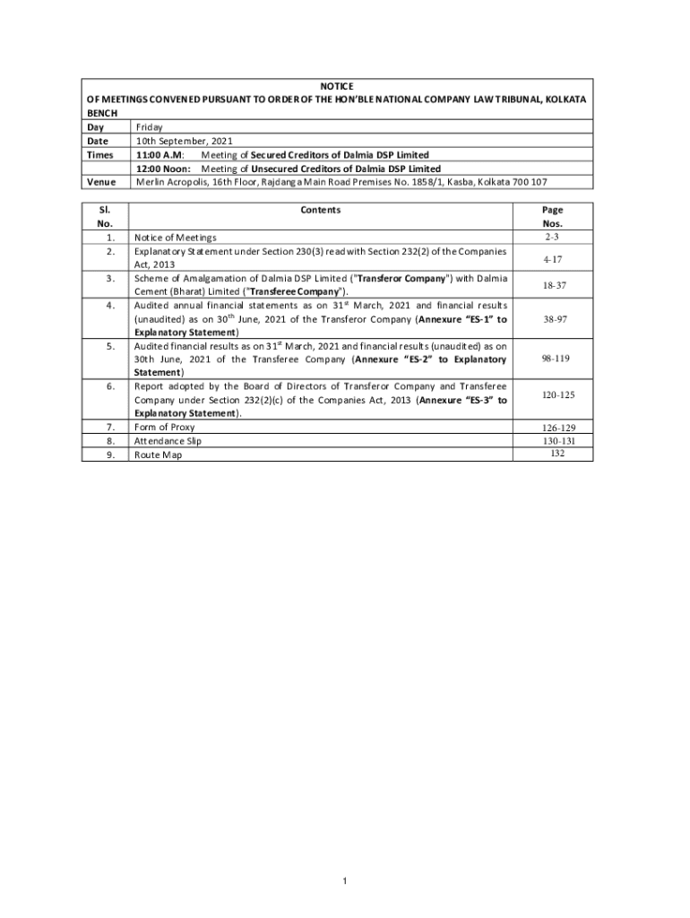 NOTICE OF MEETINGS CONVENED PURSUANT TO ORDER OF THE HOBBLE NATIONAL COMPANY LAW TRIBUNAL, KOLKATA BENCH Day Friday Date 10th September 2021 Times 11:00 A. M: Meeting of Secured Creditors of Alma