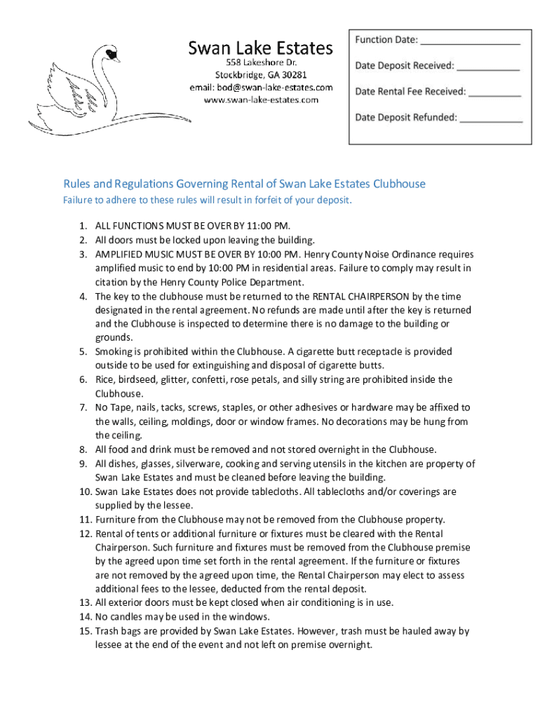 Rules and Regulations Governing Rental of Swan Lake Estates Clubhouse Failure to adhere to these rules will result in forfeit of your deposit. 1. ALL FUNCTIONS MUST BE OVER BY 11:00 PM. 2. All doors