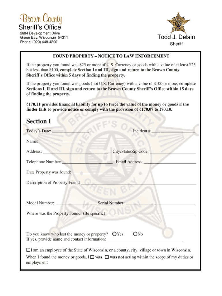 Sheriffs Office 2684 Development Drive Green Bay, Wisconsin 54311 Phone: (920) 4484200Todd J. Detain SheriffFOUND PROPERTY NOTICE TO LAW ENFORCEMENT If the property you found was $25 or more of U.S.