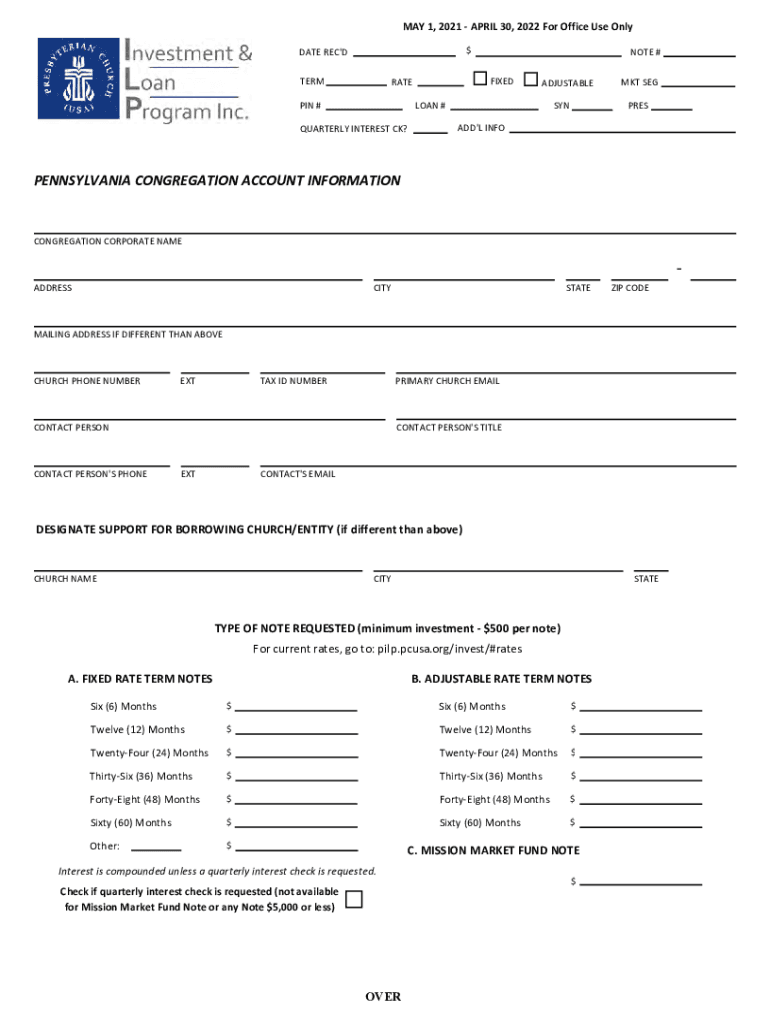 MAY 1, 2021, APRIL 30, 2022, For Office Use Only $DATE REC\'DENOTE # FIXEDRATEADJUSTABLELOAN #PIN # QUARTERLY INTEREST CK?MKT SEG PRESSBOARD\'L INFOPENNSYLVANIA CONGREGATION ACCOUNT INFORMATIONCONGREGATION