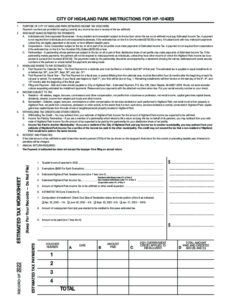 CITY OF HIGHLAND PARK INSTRUCTIONS FOR HP1040ES 1. 2.3.4.5.6.7.PURPOSE OF CITY OF HIGHLAND PARK ESTIMATED INCOME TAX VOUCHERS: Payment vouchers are provided for paying currently any income tax due