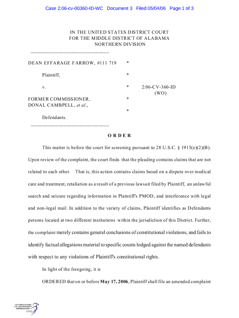 Case 2:06cv00360IDWC Document 3 Filed 05×04/06-Page 1 of 3IN THE UNITED STATES DISTRICT COURT FOR THE MIDDLE DISTRICT OF ALABAMA NORTHERN DIVISION ___ DEAN GARAGE FARROW, #111 719×Plaintiff, ×v.×FORMER
