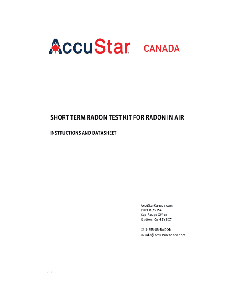 SHORT TERM RADON TEST KIT FOR RADON IN AIR INSTRUCTIONS AND DATASHEETAccuStarCanada.com PO BOX 75154 Carouse Office Quebec, QC G1Y 3C7 185585RADON info×accustarcanada.comv1.2SHORT TERM RADON TEST