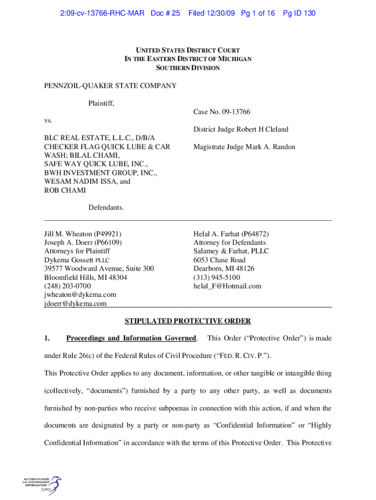 2:09cv13766RHCMAR Doc # 25Filed 12×30/09 Pg 1 of 16Pg ID 130UNITED STATES DISTRICT COURT IN THE EASTERN DISTRICT OF MICHIGAN SOUTHERN DIVISION PENNZOILQUAKER STATE COMPANY Plaintiff, Case No. 0913766