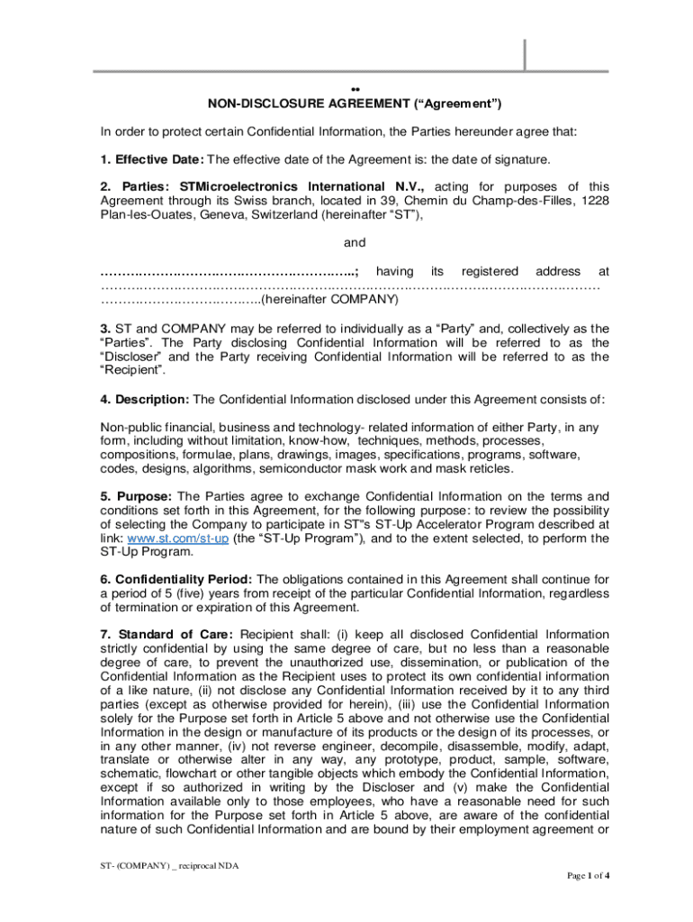 NONDISCLOSURE AGREEMENT (Agreement) In order to protect certain Confidential Information, the Parties hereunder agree that: 1. Effective Date: The effective date of the Agreement is: the date of signature.