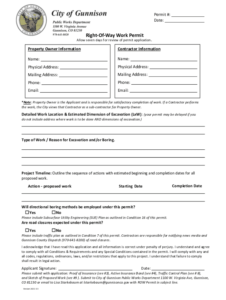 Permit #: ___ Date: ___RightOfWay Work Permalloy seven days for review of permit application. Property Owner InformationContractor Informational:Name:Physical Address:Physical Address:Mailing Address: