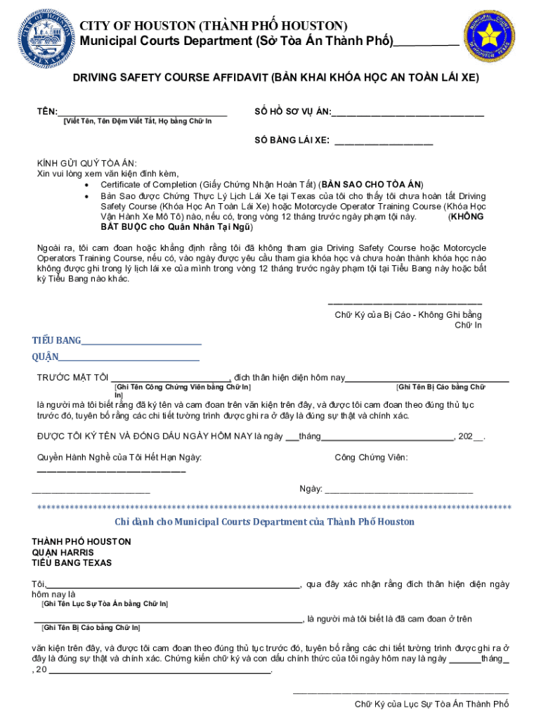 CITY OF HOUSTON (THA NH PH HOUSTON) Municipal Courts Department (S Ta n Thanh pH) DRIVING SAFETY COURSE AFFIDAVIT (IN KHAN HC AN TON LI XE) TN:S H S VU AN:___[It Tn, Tn m It TT, H BNG Ch INS BNG LI