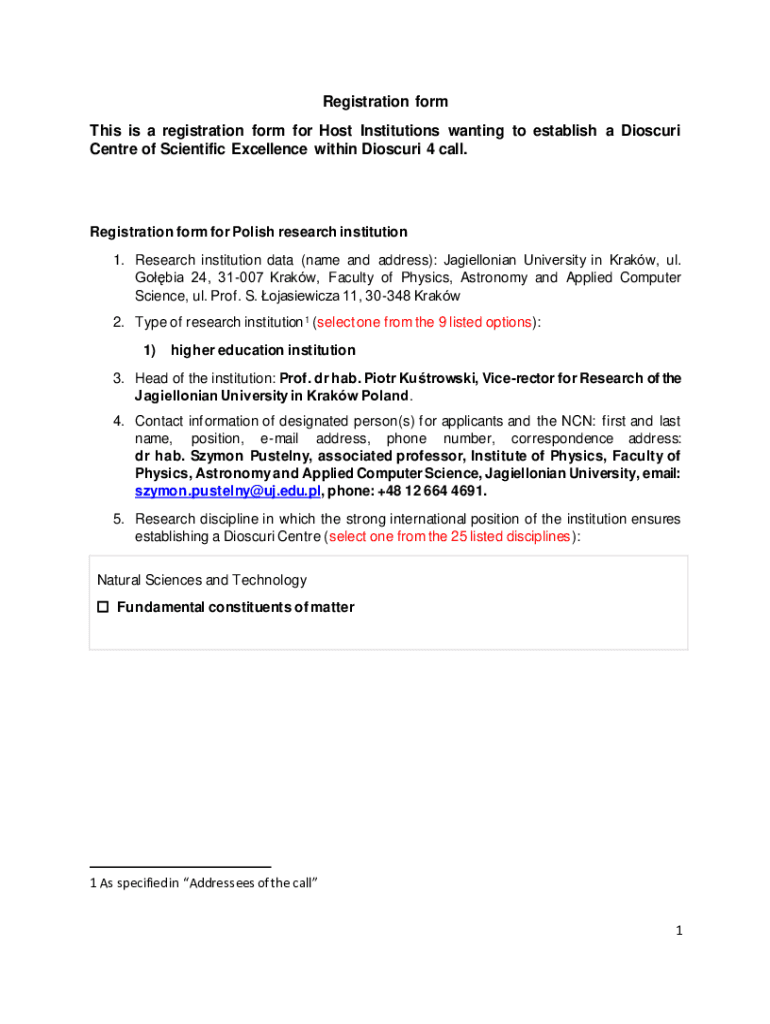 Registration form This is a registration form for Host Institutions wanting to establish a Missouri Center of Scientific Excellence within Missouri 4 call. Registration form for Polish research institution