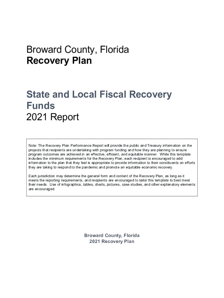 Broward County, Florida Recovery Plan State and Local Fiscal Recovery Funds 2021 Report Note: The Recovery Plan Performance Report will provide the public and Treasury information on the projects