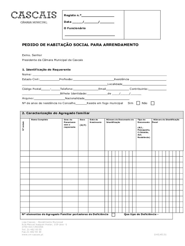 Register n. Data ___//O FuncionrioPEDIDO DE HABITAT SOCIAL PARA ARRENDAMENTO Elmo. Senior President the Clara Municipal de Cascais 1. Identified do Reference Nome: Est ado Civil:Professor:Residence