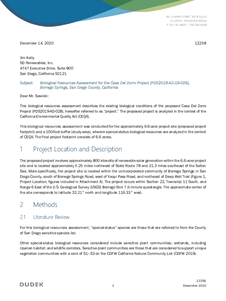 December 14, 202012258Jim Kelly SD Renewables, Inc. 4747 Executive Drive, Suite 800 San Diego, California 92121 Subject:Biological Resources Assessment for the Casa Del Zorro Project (PDS2019AD19028×,