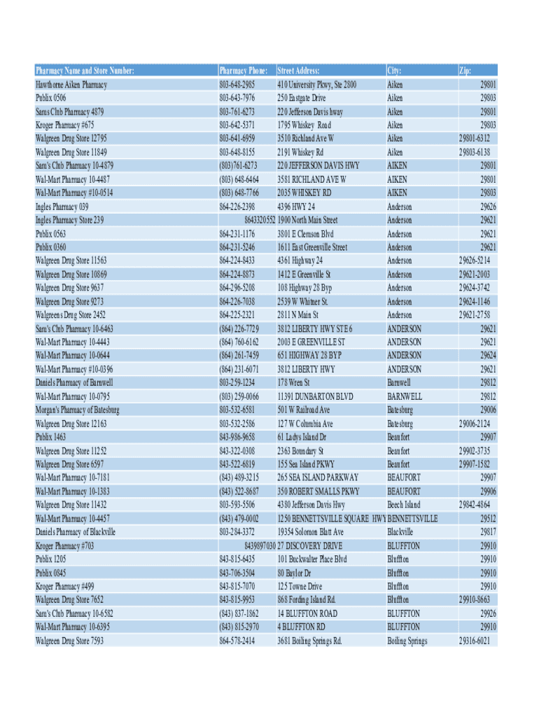 Pharmacy Name and Store Number: Hawthorne Aiken Pharmacy Publix 0506 Sam's Club Pharmacy 4879 Kroger Pharmacy #675 Walgreen Drug Store 12795 Walgreen Drug Store 11849 Sam\'s Club Pharmacy 104879 Walmart