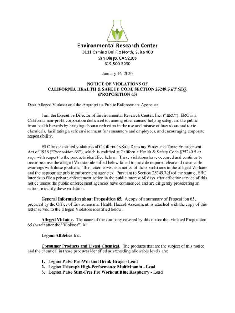 Environmental Research Center 3111 Camino Del Rio North, Suite 400 San Diego, CA 92108 6195003090 January 16, 2020, NOTICE OF VIOLATIONS OF CALIFORNIA HEALTH & SAFETY CODE SECTION 25249.5 ET SEQ.