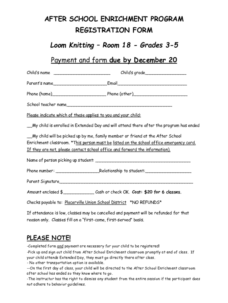 AFTER SCHOOL ENRICHMENT PROGRAM REGISTRATION FORM Loom Knitting Room 18 Grades 35 Payment and form due by December 20 Child's name ___Child's grade___Parents name___ Email___ Phone (home)___ Phone