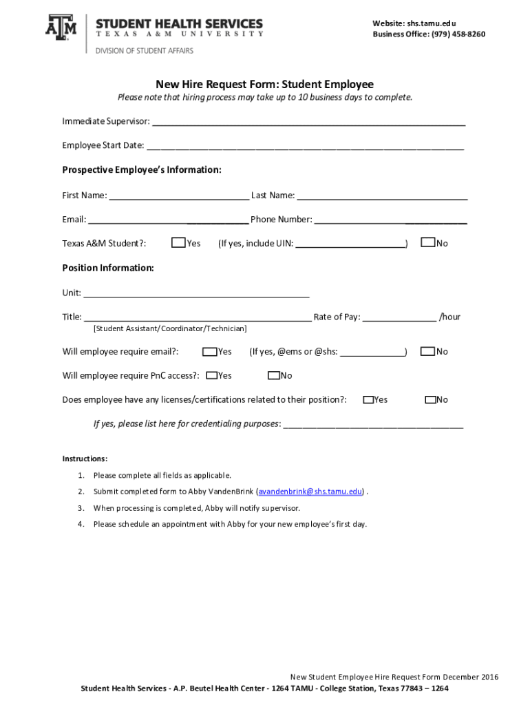 Website: SHS.tame.edu Business Office: (979) 4588260New Hire Request Form: Student Employee Please note that hiring process may take up to 10 business days to complete. Immediate Supervisor: ___ Employee