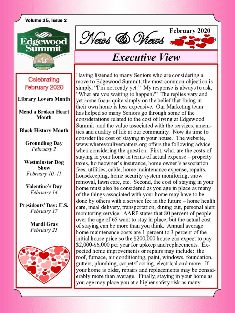 Volume 25, Issue 2News & Views February 2020Executive View Celebrating February 2020 Library Lovers Month Mend a Broken Heart Month Black History Month Groundhog Day February 2 Westminster Dog Show
