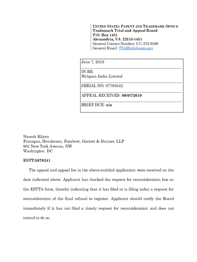 UNITED STATES PATENT AND TRADEMARK OFFICE Trademark Trial and Appeal Board P.O. Box 1451 Alexandria, VA 223131451 General Contact Number: 5712728500 General Email: Fabinho×USPTO.gov June 7, 2019