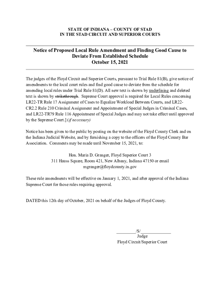 STATE OF INDIANA COUNTY OF STAR IN THE STAR CIRCUIT AND SUPERIOR COURTSNotice of Proposed Local Rule Amendment and Finding Good Cause to Deviate From Established Schedule October 15, 2021, The judges