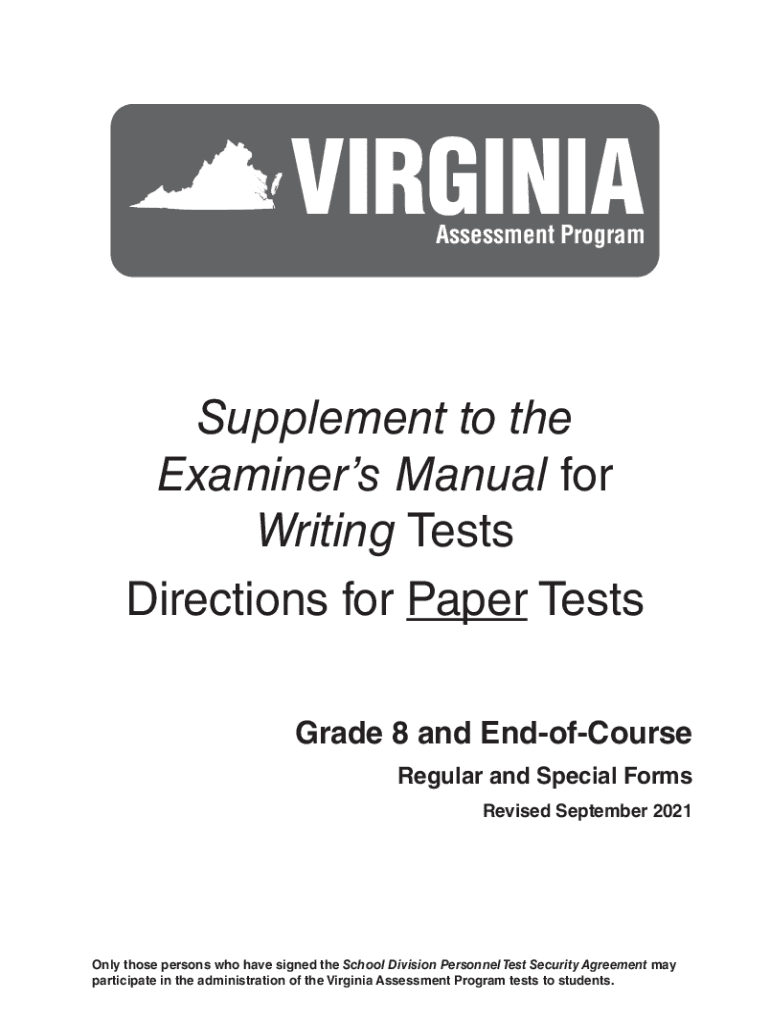 VIRGINIAAssessment ProgramSupplement to the Examiners Manual for Writing Tests Directions for Paper Tests Grade 8 and EndofCourse Regular and Special Forms Revised September 2021Only those persons