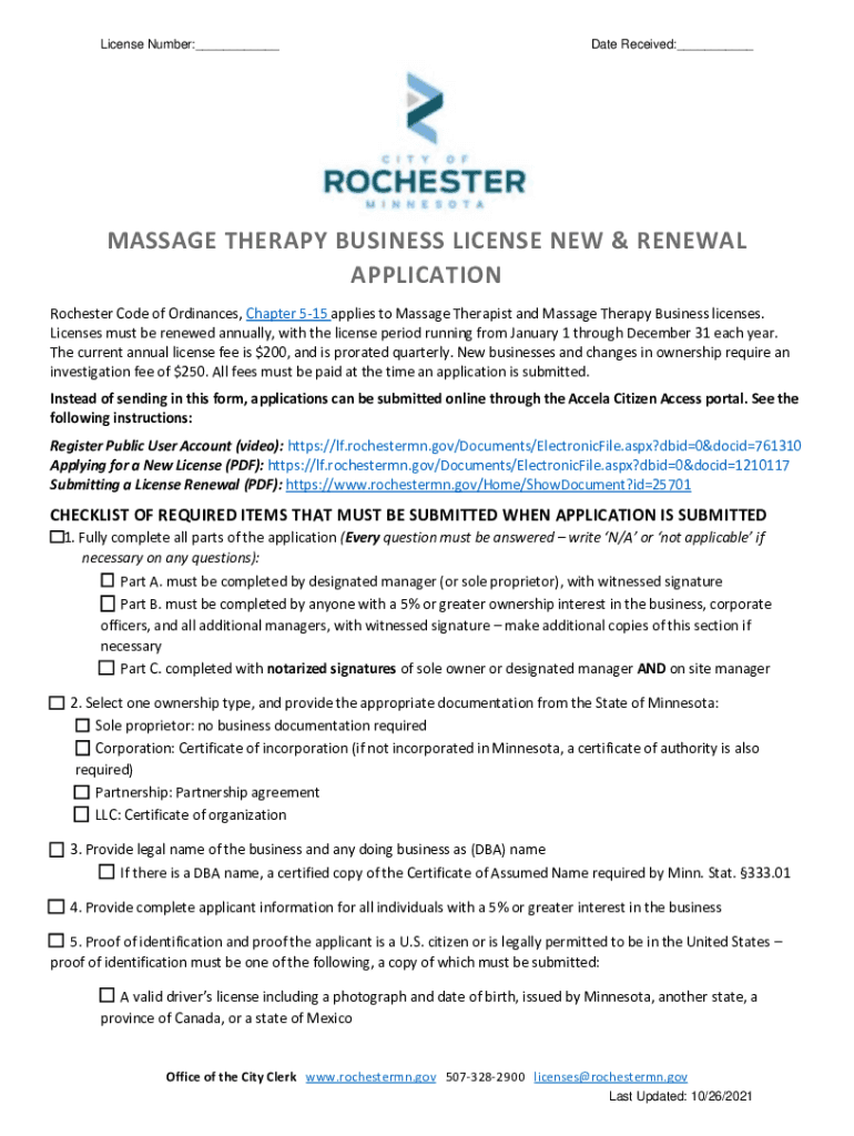 License Number:___Date Received:___MASSAGE THERAPY BUSINESS LICENSE NEW & RENEWAL APPLICATION Rochester Code of Ordinances, Chapter 515 applies to Massage Therapist and Massage Therapy Business licenses.