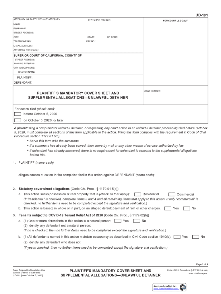UD101 ATTORNEY OR PARTY WITHOUT ATTORNEYSTATE BAR NUMBER:FOR COURT USE ONLINE: FIRM NAME: STREET ADDRESS: CITY:STATE:TELEPHONE NO.:ZIP CODE:FAX NO.:EMAIL ADDRESS: ATTORNEY FOR (name):SUPERIOR COURT