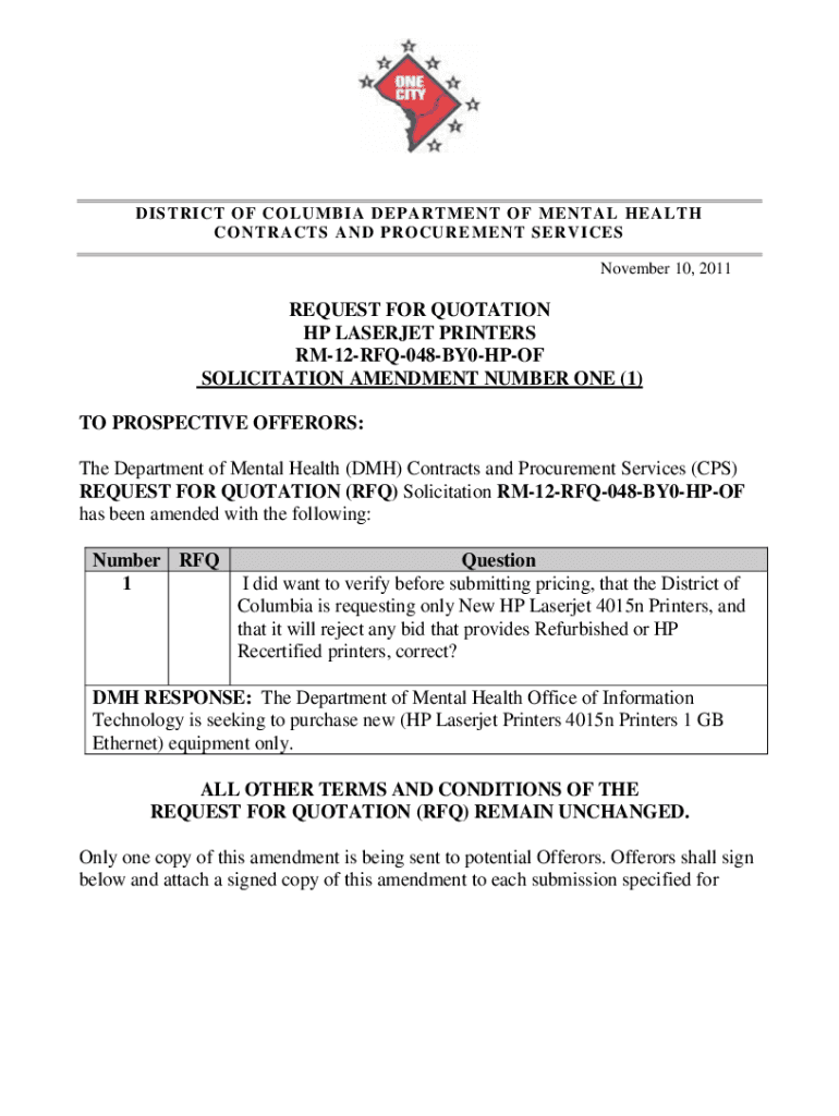 DISTRICT OF COLUMBIA DEPARTMENT OF MENTAL HEALTH CONTRACTS AND PROCUREMENT SERVICES November 10, 2011REQUEST FOR QUOTATION HP LASER PRINTERS RM12RFQ048BY0HPOF SOLICITATION AMENDMENT NUMBER ONE (1)