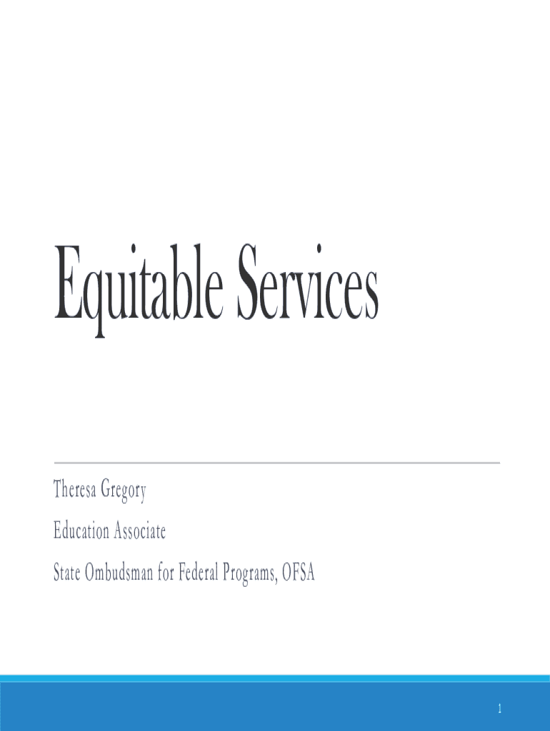 Equitable Services T h e r ESA G r e g o r y E d u ca ti o n A s s o c i an S t a t e Om b u d man f o r Fe d e ran P r o g rams, OF S A1Housekeeping To reduce distractions during the presentation,